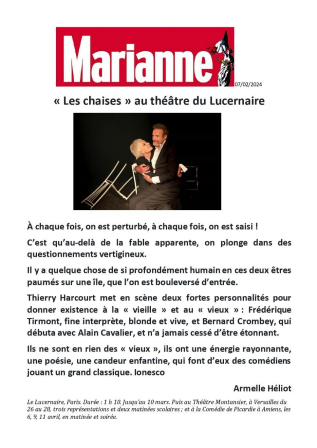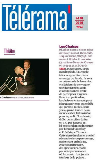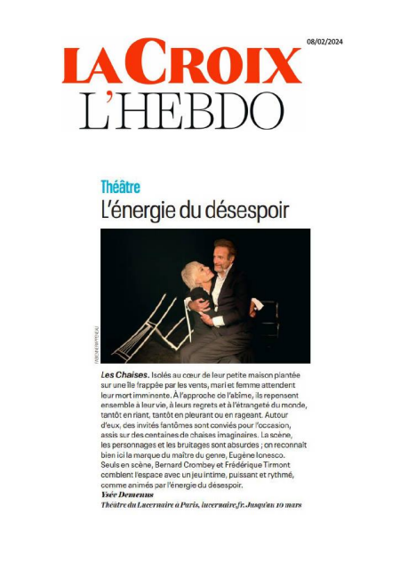 La vie ne serait-elle pas tout simplement un espace-temps un peu fou entre la vie et la mort ? Les êtres humains ne sont-ils pas tous capables de réactions plus ou moins incohérentes, lorsqu’ils approchent de l’abime ? C’est la situation de la pièce, celle de deux êtres plongés dans une solitude extrême face au crépuscule de leurs vies. On a le sentiment qu’ils ne mourront jamais, tant que l’imagination du jeu à conjurer le sort ne s’éteindra pas. Ionesco devient alors maître du genre, magnifiquement. On rit de cette absurdité, on est ému et c’est au final la poésie qui l’emporte.
